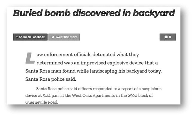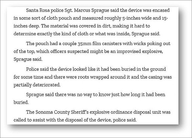 When police arrived at the Guerneville Road residence, they saw what was eventually confirmed to be an improvised explosive device measuring approximately 15 inches by 5 inches. Inside the device, 35 mm film canisters were visible, and wicks were seen sticking out of the top. The device was deteriorated and had been in the ground for so long that roots had grown all around it.
